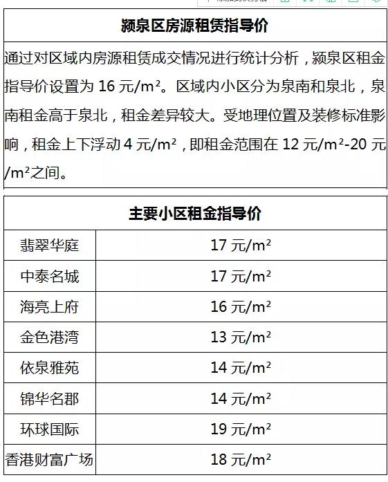 阜阳城区2018年第一季度房屋租金指导价信息公布