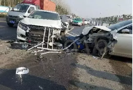 阜阳向阳路大桥附近三车相撞!气囊弹出,车头面目全非…