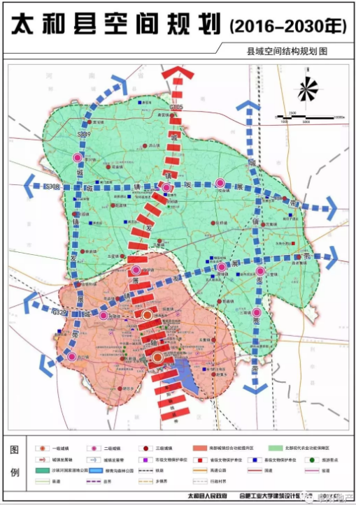 “一轴四带”:“一轴”指G105城镇发展轴,“四带”指沿道路太和西部干线(S449)、太和北部干线(S308)、太和东部干线(S252)、G329形成的城镇次要发展带。